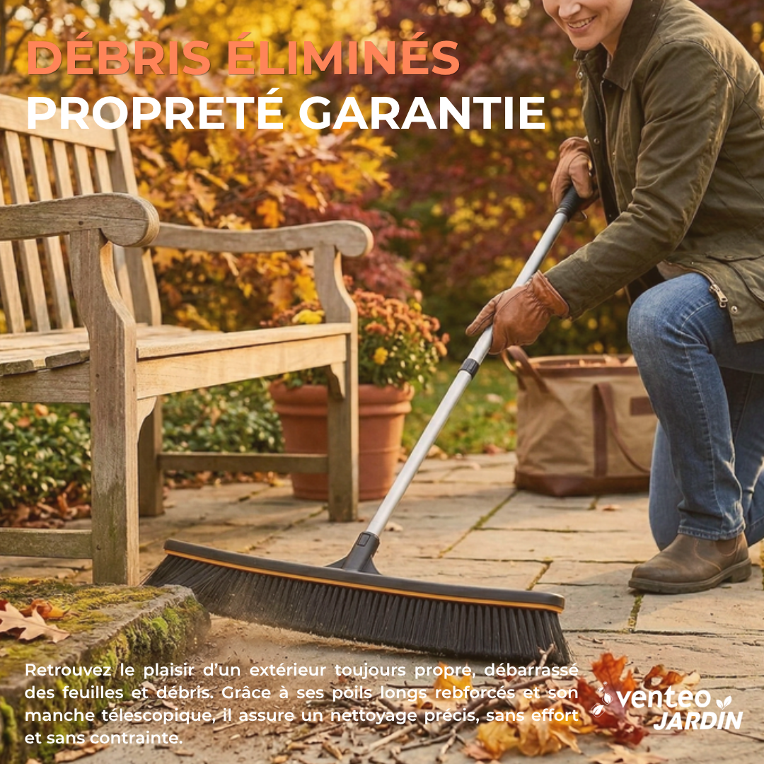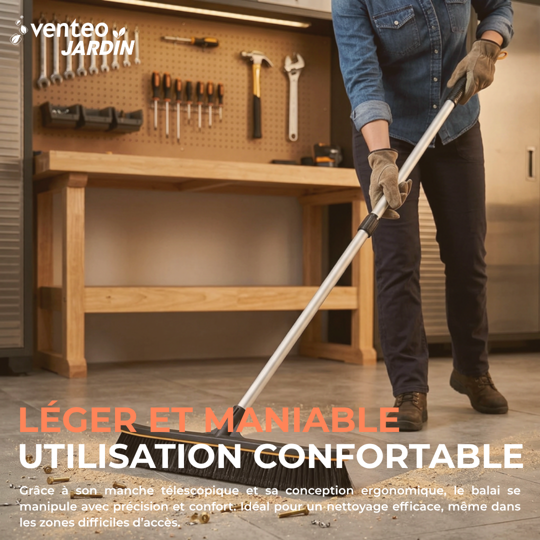 Pour réduire l’effort, il est conseillé d’utiliser un balai qui glisse bien sur le sol et qui regroupe facilement les déchets. Une bonne ergonomie facilite les mouvements répétés. Le balai Pro RootSlayer, avec son manche télescopique et sa structure équilibrée, permet un balayage plus fluide et confortable.