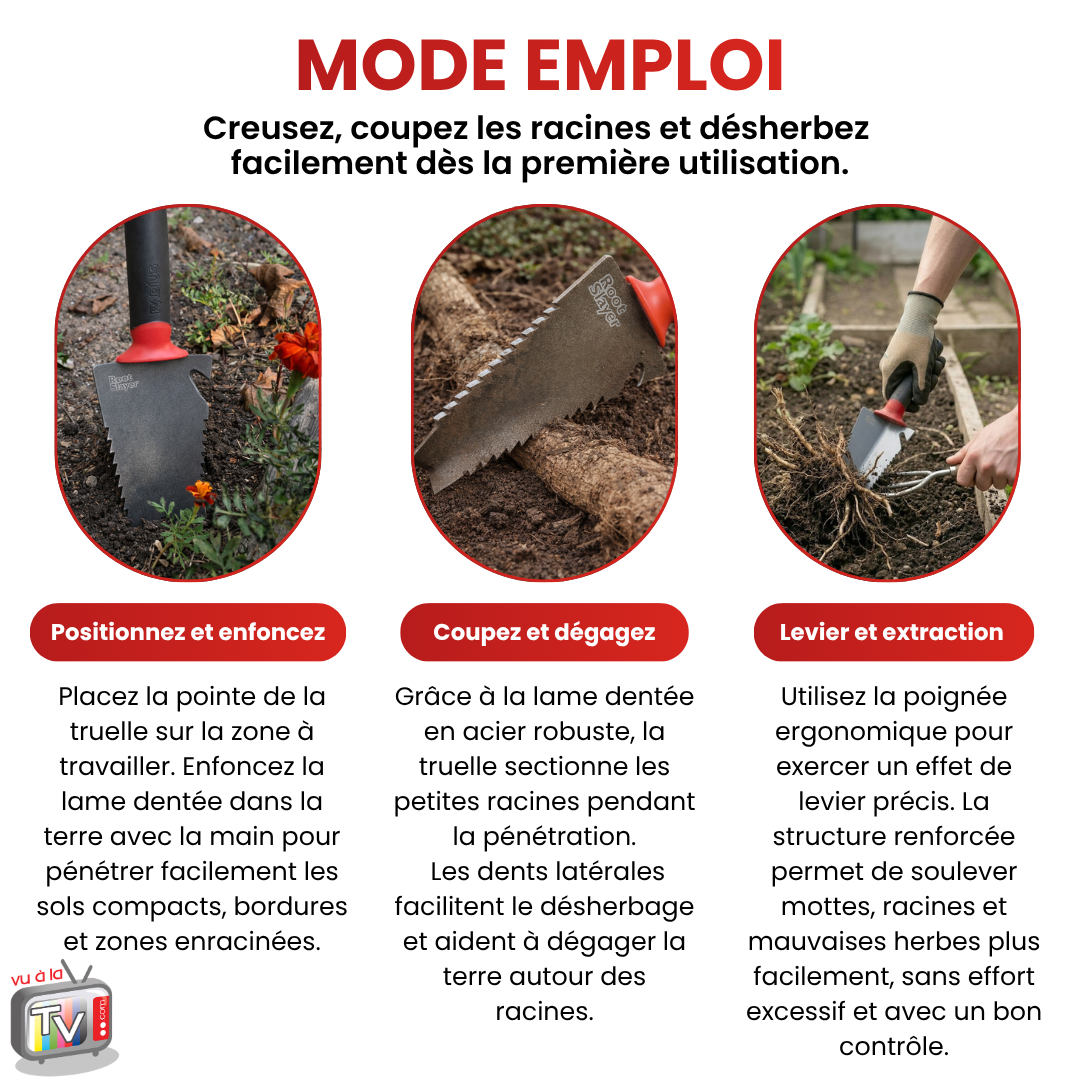 Un transplantoir peut être utilisé pour plusieurs tâches si sa conception le permet. Une lame adaptée permet de travailler au contact des racines superficielles. Le transplantoir RootSlayer est équipé de dents latérales affûtées et d’une lame en acier carbone, permettant de travailler sur les petites racines et le désherbage léger.